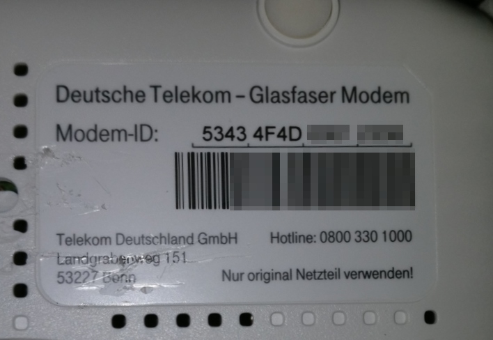 Auf der Rückseite des Telekom-Glasfaser Modem ist ein Etikett zu finden, das die Seriennummer trägt: