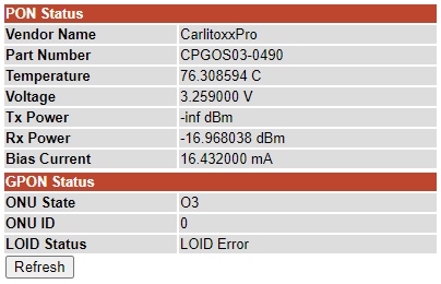 Laut Anleitung erreicht man die userinterfaces des Moduls über die IP-Adresse 192.168.1.1. Diese wird allerdings erst aktiv, wenn das Modul an der SC-Kupplung ein passendes Signal entdeckt. Also habe ich das Modul an die Gf-TA der Telekom angeschlossen und das SFP-Interface meines Mikrotik-Routers (hEX S) entsprechend konfiguriert.